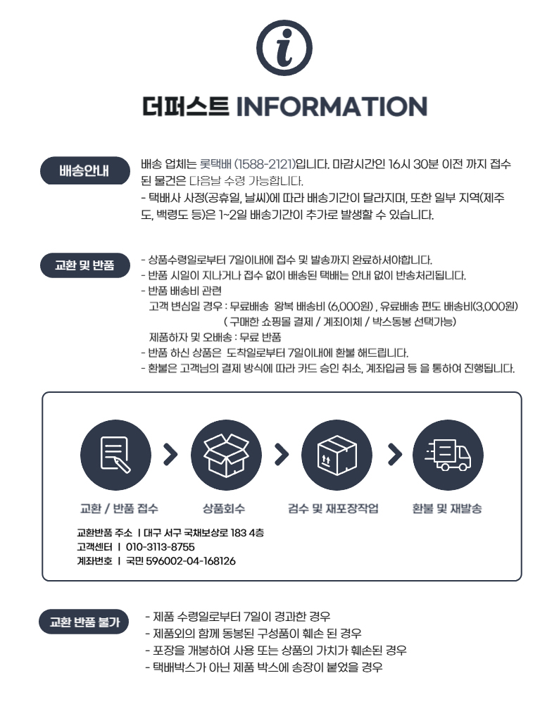 - - 교환/반품 안내: 고객변심 및 주문착오에 의한 교환/반품은 제품 수령일로부터 7일 이내 가능합니다.